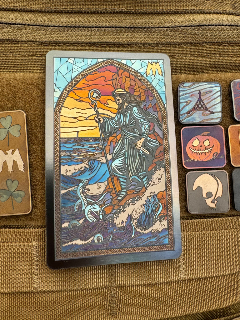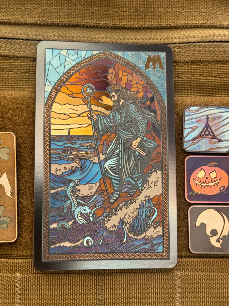 This limited edition run of “St. Patrick” patches starts with domestically sourced 6-4 Titanium, which is deeply engraved and colored in our own fiber laser. All edges are hand smoothed and hook backing is permanently applied.