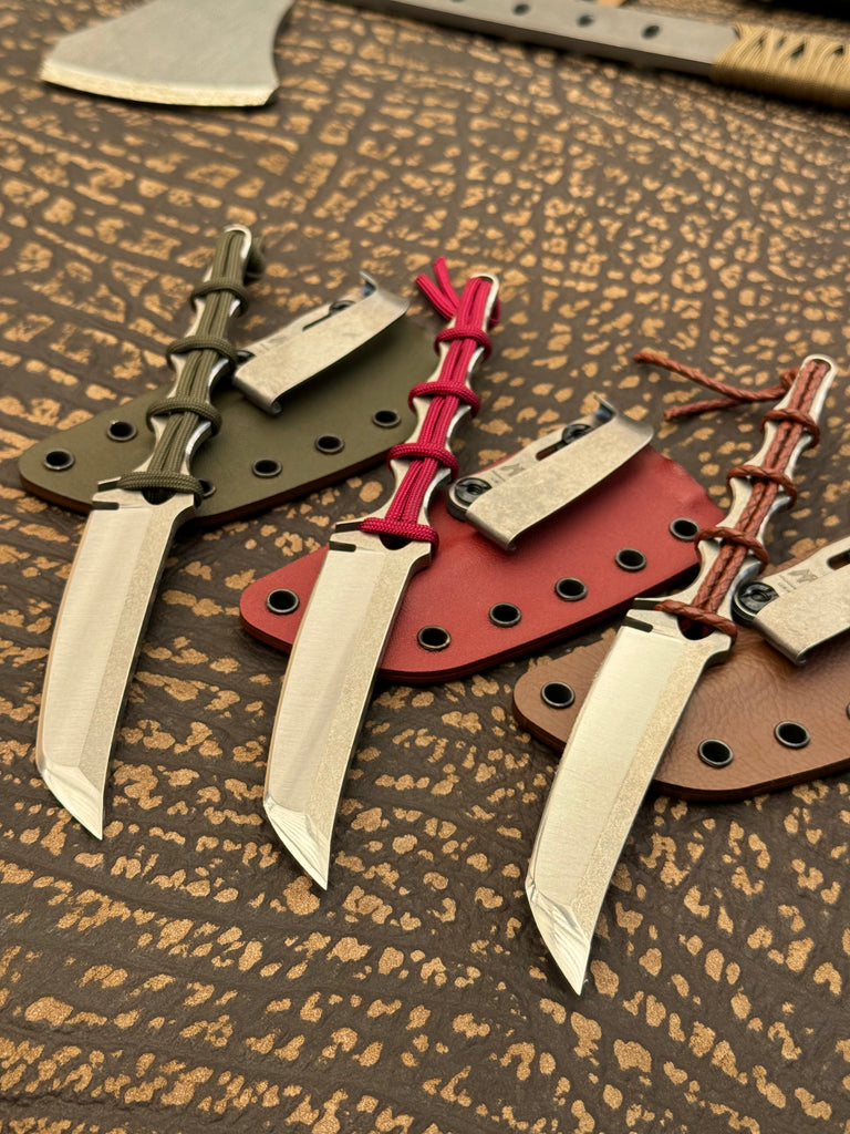 All of our TSK-YT come with tumbled finish flats with satin finished grinds with a fitted kydex sheath and Mummert Titanium Clip™.